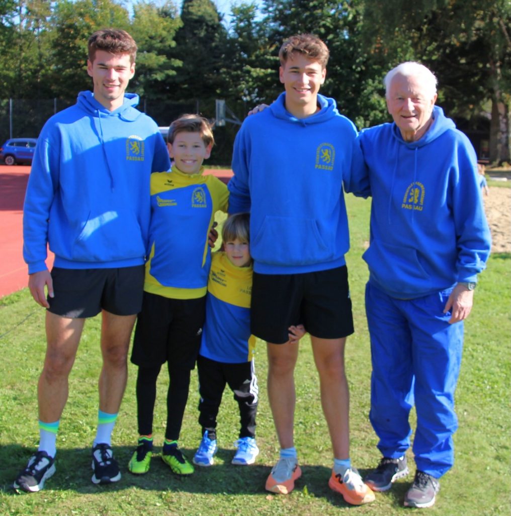 (KS.) Ein lang gehegter Wunsch von Peter Fahrnholz (re.), dem Ehrenvorsitzenden der Leichtathletik Gemeinschaft (LG) Passau, ging beim diesjährigen „McDonald`s -Schüler- und Jugendsportfest“ endlich in Erfüllung. Bei der sog. Biathlon-Staffel war erstmals das komplette Söhne-Quartett (v.li.) Jonas, Julius, Hannes und Moritz des sportbegeisterten Freizeit-Basketballers und stellvertretenden Vorsitzenden des TV Passau 1862 Wolfgang Storch und seiner Frau Nicole im gemeinsamen Wettkampf-Einsatz.